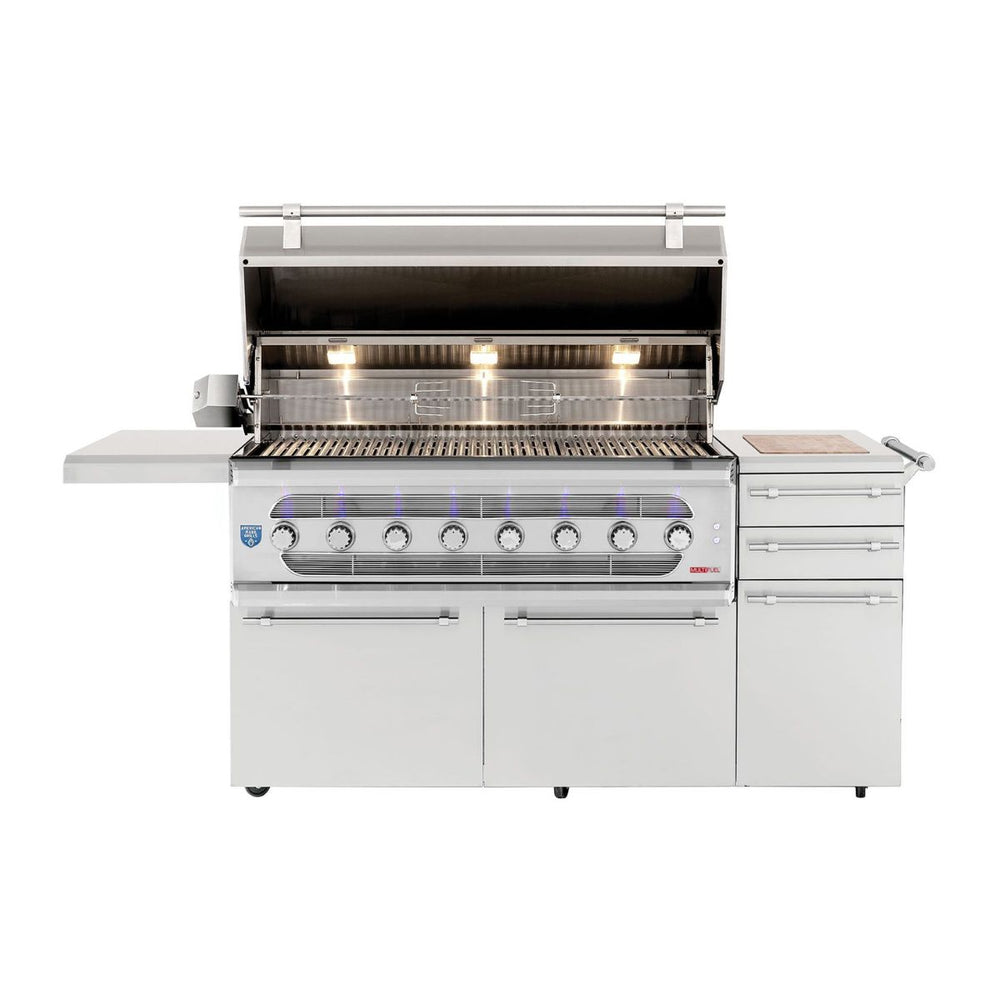 The innovative flame thrower ignition system provides reliable burner ignition with a burst of flame, eliminating the hassle of traditional spark ignition systems. Additionally, the double-lined, spring-assisted hood helps maintain consistent temperatures, while the built-in 3-inch temperature gauge and interior halogen lighting enhance your cooking precision. The LED front panel lighting ensures visibility in low light, making nighttime grilling effortless. Packed with premium accessories, this grill comes with a weather-proof vinyl cover, a rotisserie kit with a 100-pound motor, leather gloves, grate lifting tools, a drop-in 22,000 BTU infrared sear burner, a griddle and a care kit.