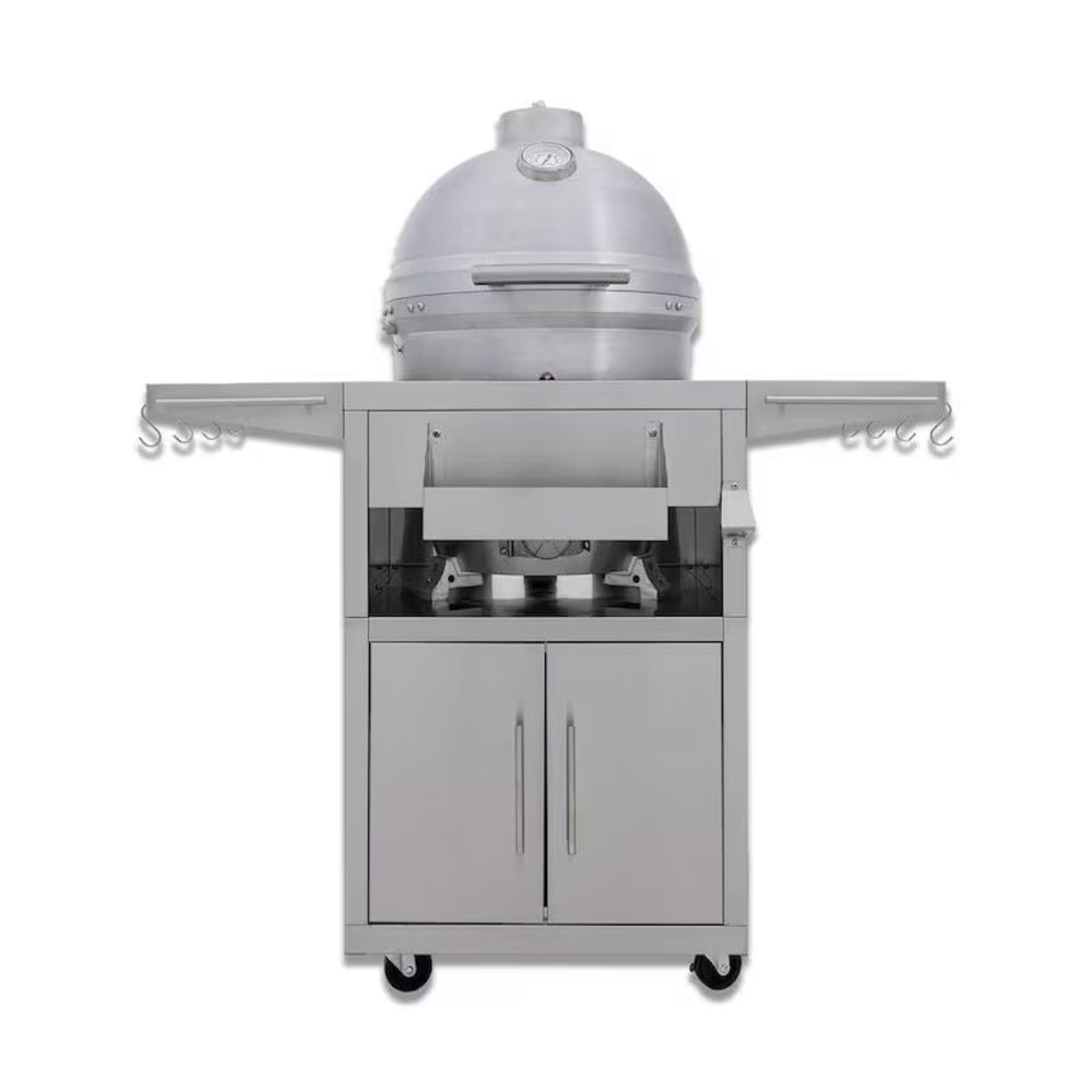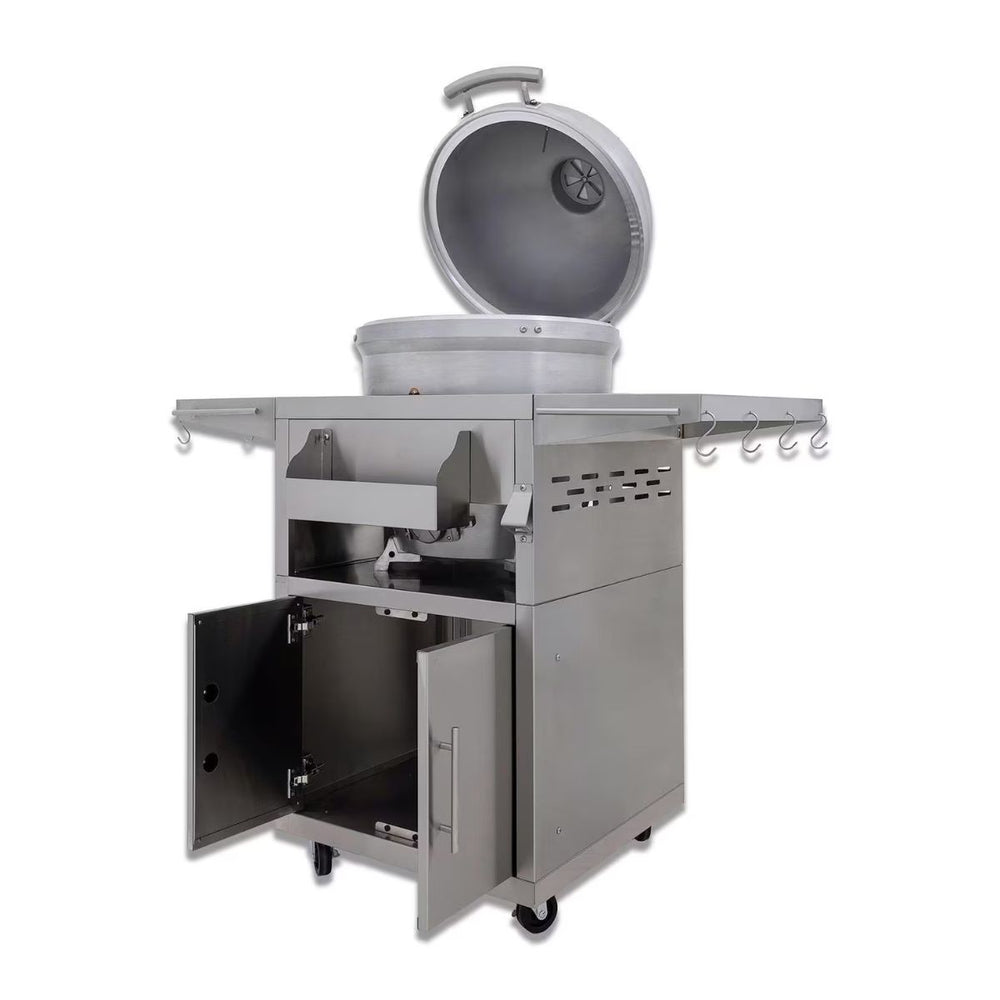 The 20-inch hinged cooking grate allows easy charcoal or wood additions, while the large analog thermometer with smoking, roasting, and searing markers ensures perfect results. Cast aluminum feet provide stable support, making this grill ideal for any outdoor kitchen.