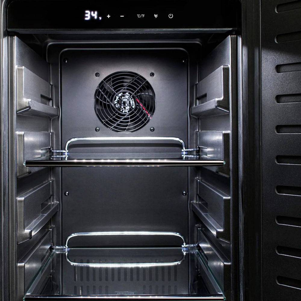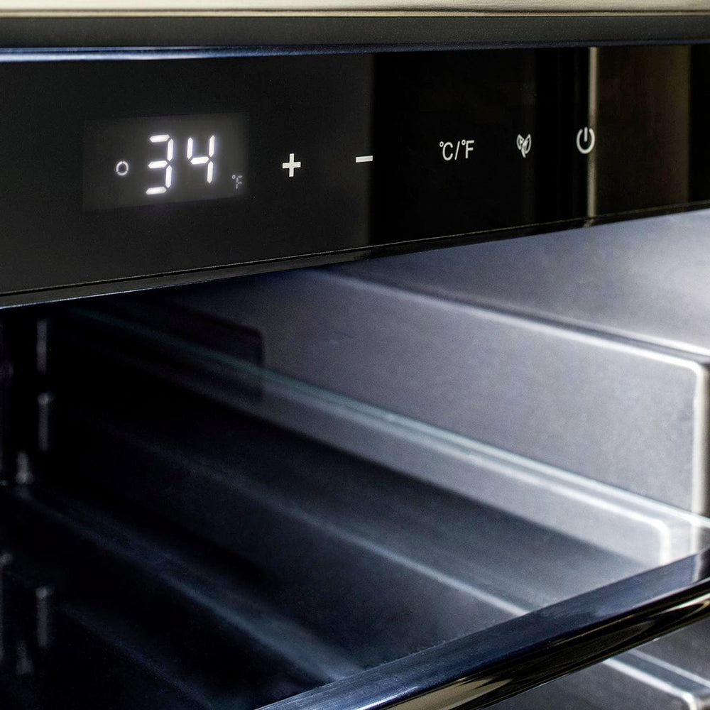 Adjustable digital temperature controls (34–68°F) and three glass shelves offer tailored storage, while a white LED interior light ensures easy visibility. The field-reversible door with a sleek straight bar handle and lock adds security and style.