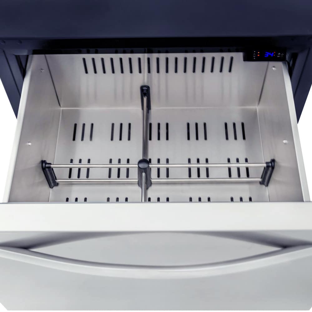 Two soft-close drawers with adjustable dividers offer customizable storage, while a concealed digital thermostat ensures precise temperature control. Cool blue LED lighting illuminates the interior, ideal for nighttime gatherings, and the ETL-approved design ensures reliable outdoor performance.