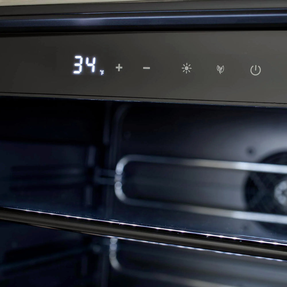 Digital temperature controls with a display maintain a precise 34–68°F range, perfect for beverages. The reversible glass door with a full-length professional handle and lock adds security and elegance, while white LED lighting illuminates contents for easy nighttime access.