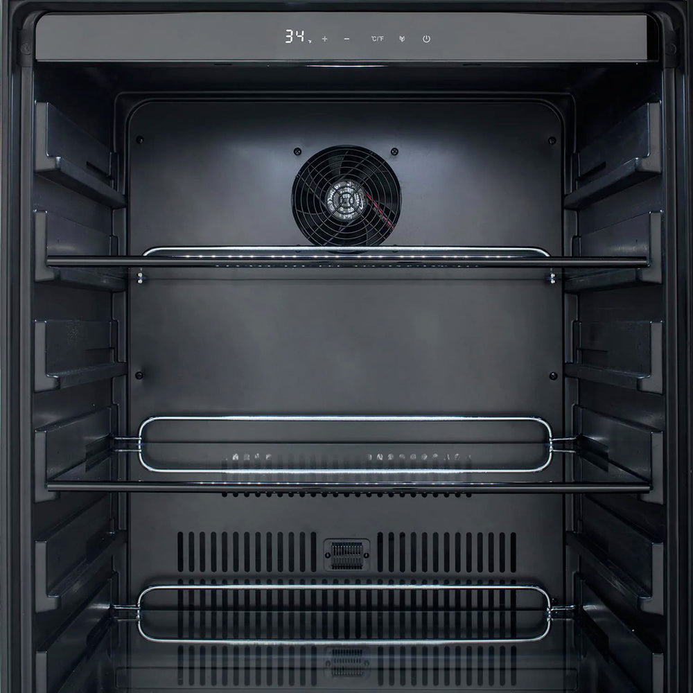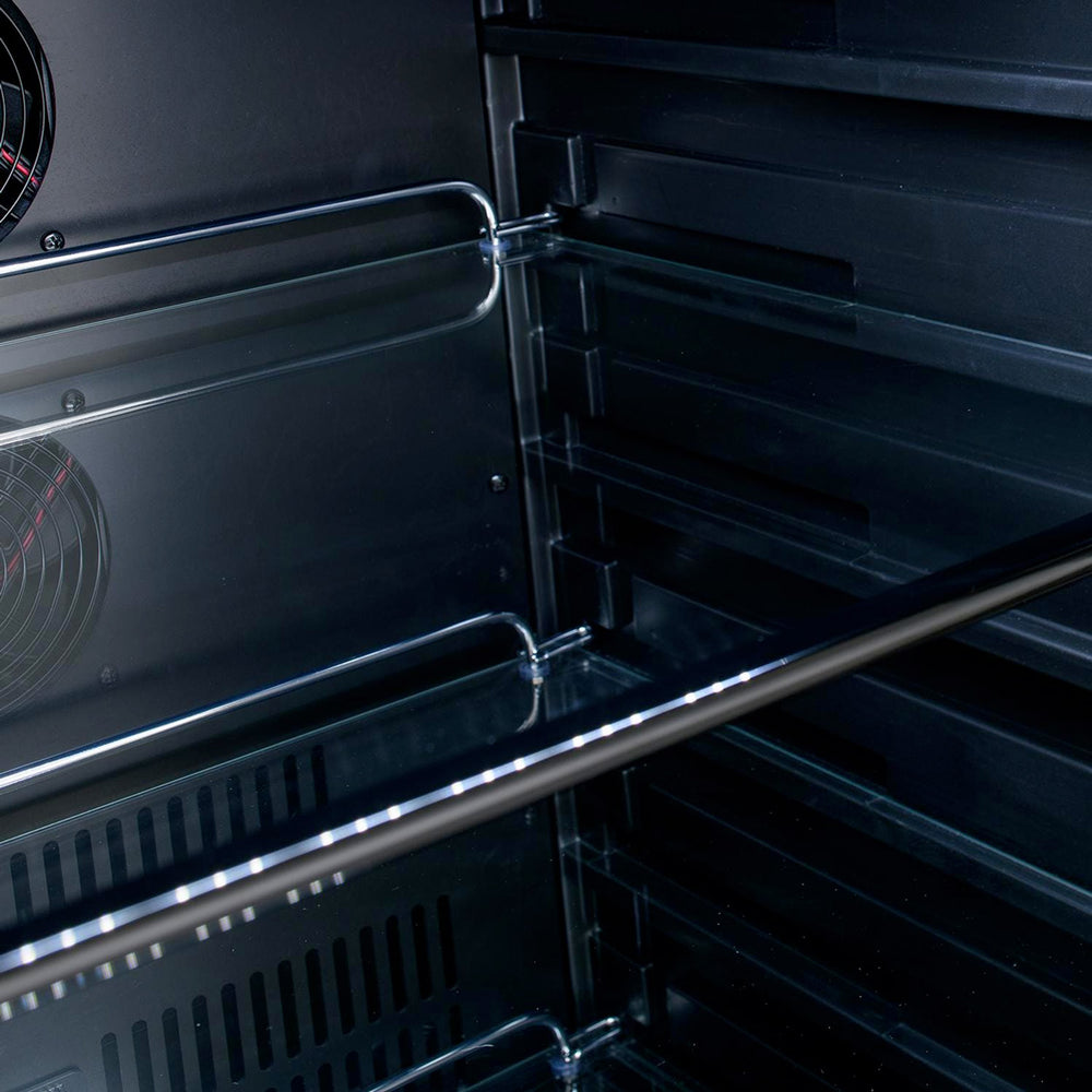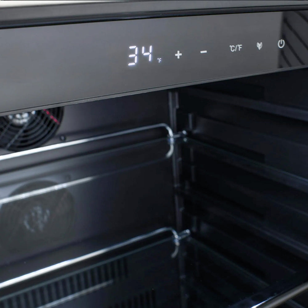 Control temperatures precisely with digital controls and a display, maintaining a 34–68°F range. The white LED interior lighting illuminates contents for easy nighttime access, complemented by a reversible stainless steel door with a full-length professional handle and lock for security.