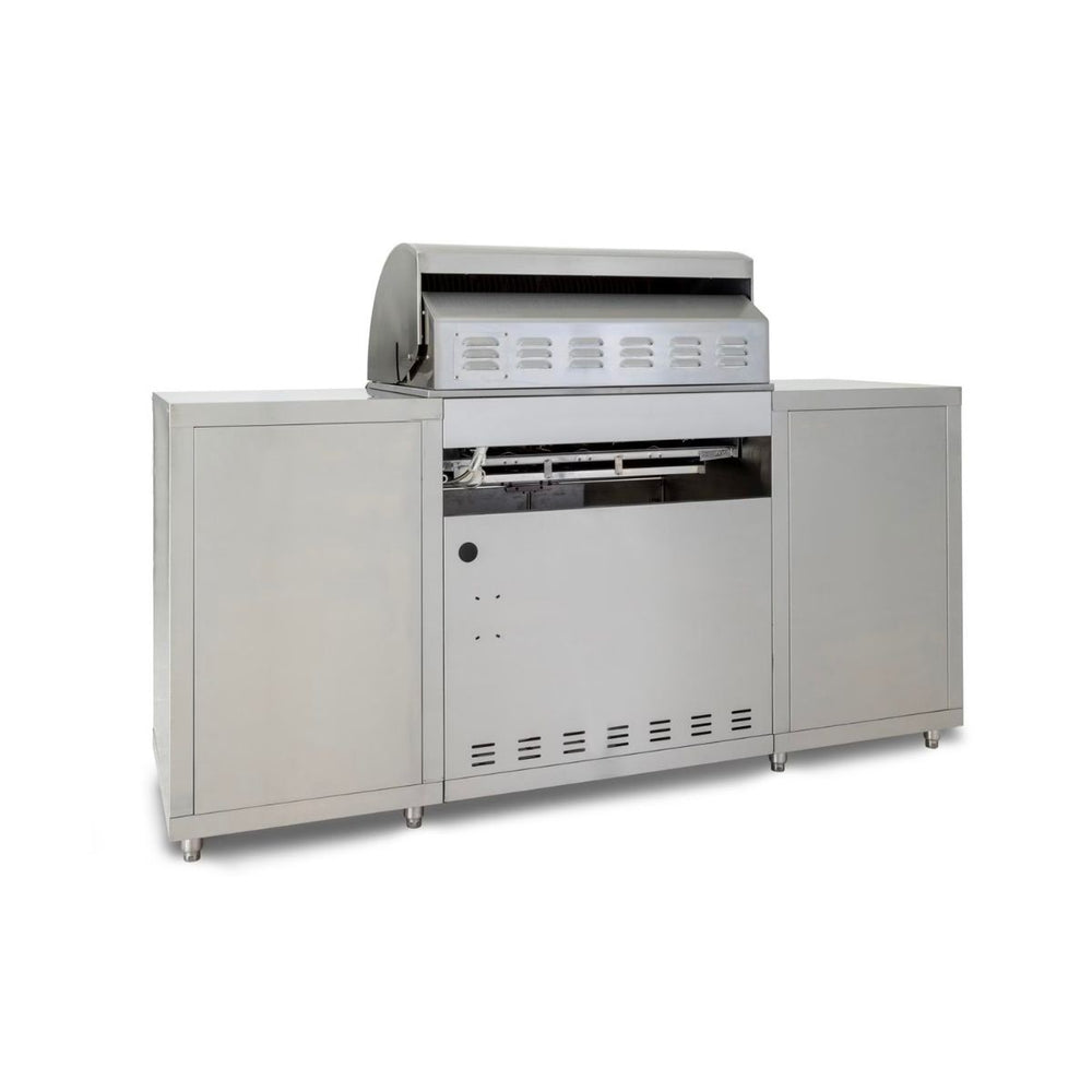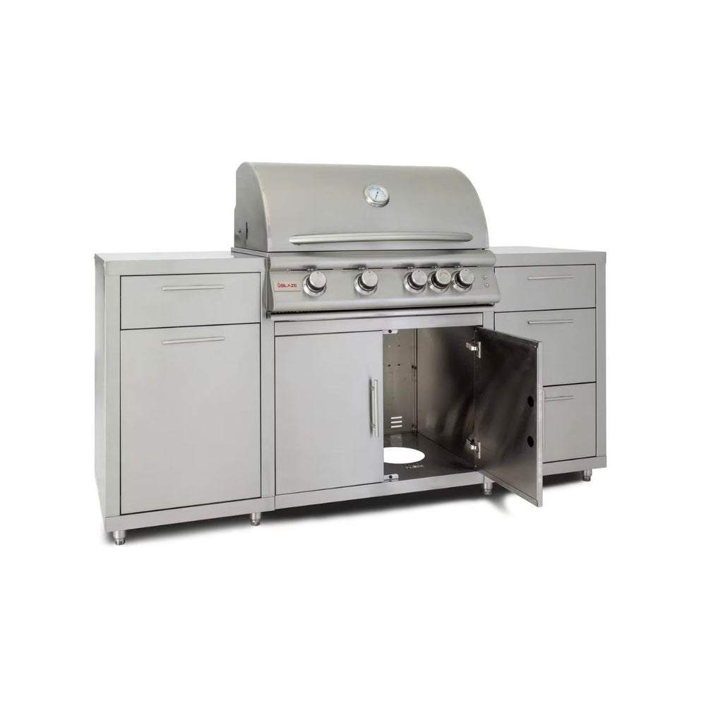 Transform your backyard with the Blaze Grill Island, crafted from durable 304 stainless steel for lasting outdoor performance. This all-in-one island, shipped on a single pallet, features a ventilated cabinet for a 20-pound propane tank, a pull-out trash bin, and three illuminated drawers for ample storage, perfect for tools and accessories.