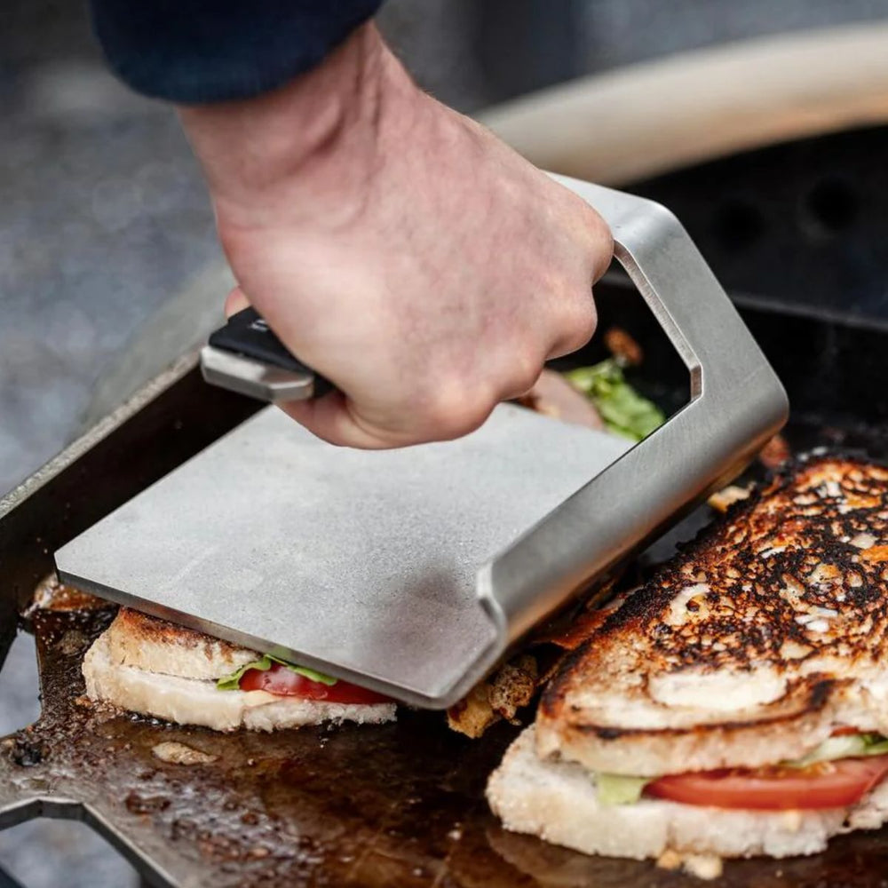 The Breeo Griddle Press is a must-have for chefs who want to achieve that perfectly seared, crispy texture on foods like smash burgers, grilled cheese, and paninis. Crafted from thick 3/16-inch 304 stainless steel, this premium press is designed for durability and consistent performance, whether used outdoors over open flames or inside on your stovetop. Built to withstand high heat, the Breeo Griddle Press brings professional-quality results to your cooking while enhancing flavors and textures with ease.