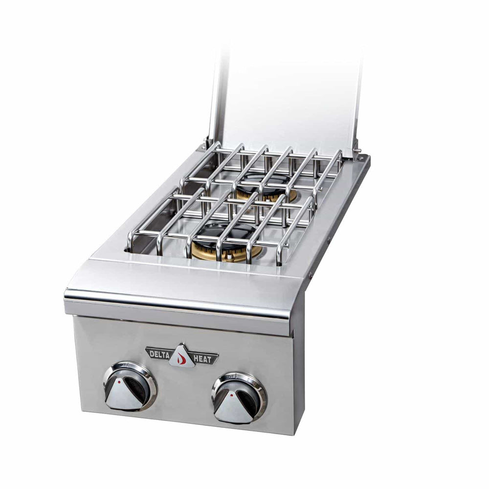 The Delta Heat Double Built-In Side Burner has two (2) heavy-duty 16,000 BTU burners that are sealed to protect against the elements making it easy to clean. This durable side burner is constructed of 304 stainless steel with sleek high-polished accents to match the Delta Heat grill line. The side burner features LED control panel lights, an electronic ignition system for easy lighting and a matching stainless steel cover to protect the burner when not in use. Delta Heat products are designed and manufactured in the USA with pride.