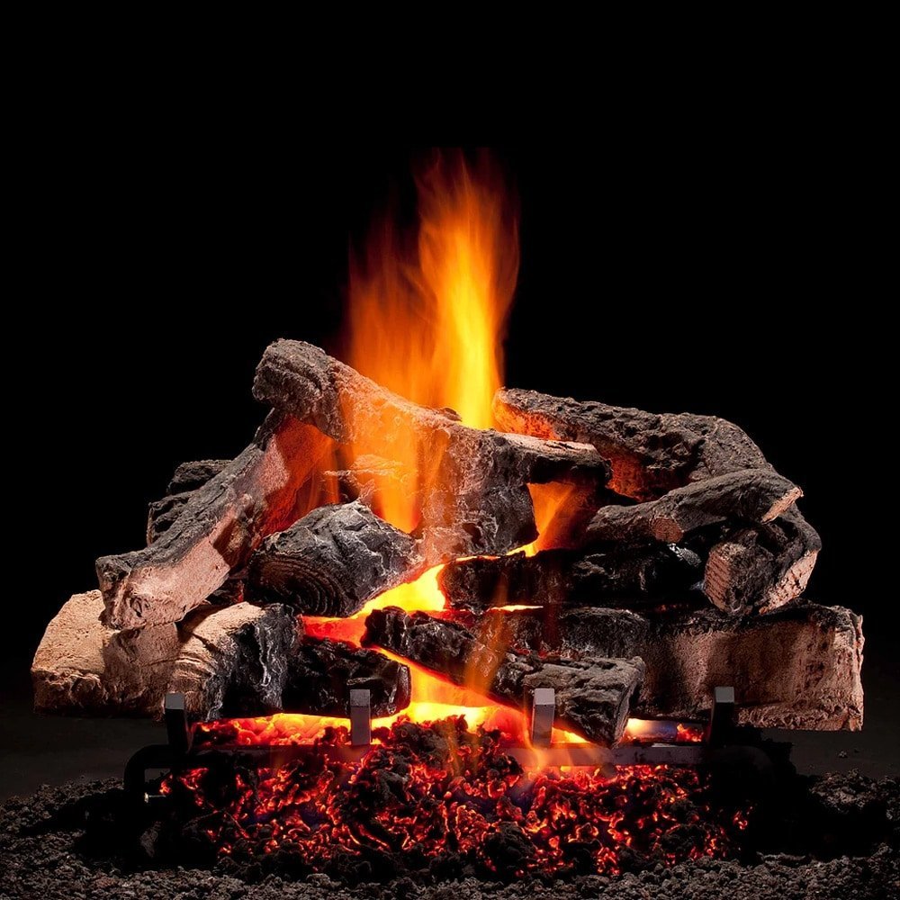 The Hargrove Rustic Timbers Vented Radiant Gas Log Set combines large and small logs with dark charring and colorful split wood textures to create a stunningly realistic fire display. Each log is hand-painted and carefully crafted, ensuring exceptional detail and a natural, rugged appearance. Designed to bring warmth and ambiance to any space, this set pushes the glowing embers forward, enhancing the depth and radiance of the fire. The unique combination of varied log shapes and rich textures makes this set a perfect addition to any traditional or modern hearth.