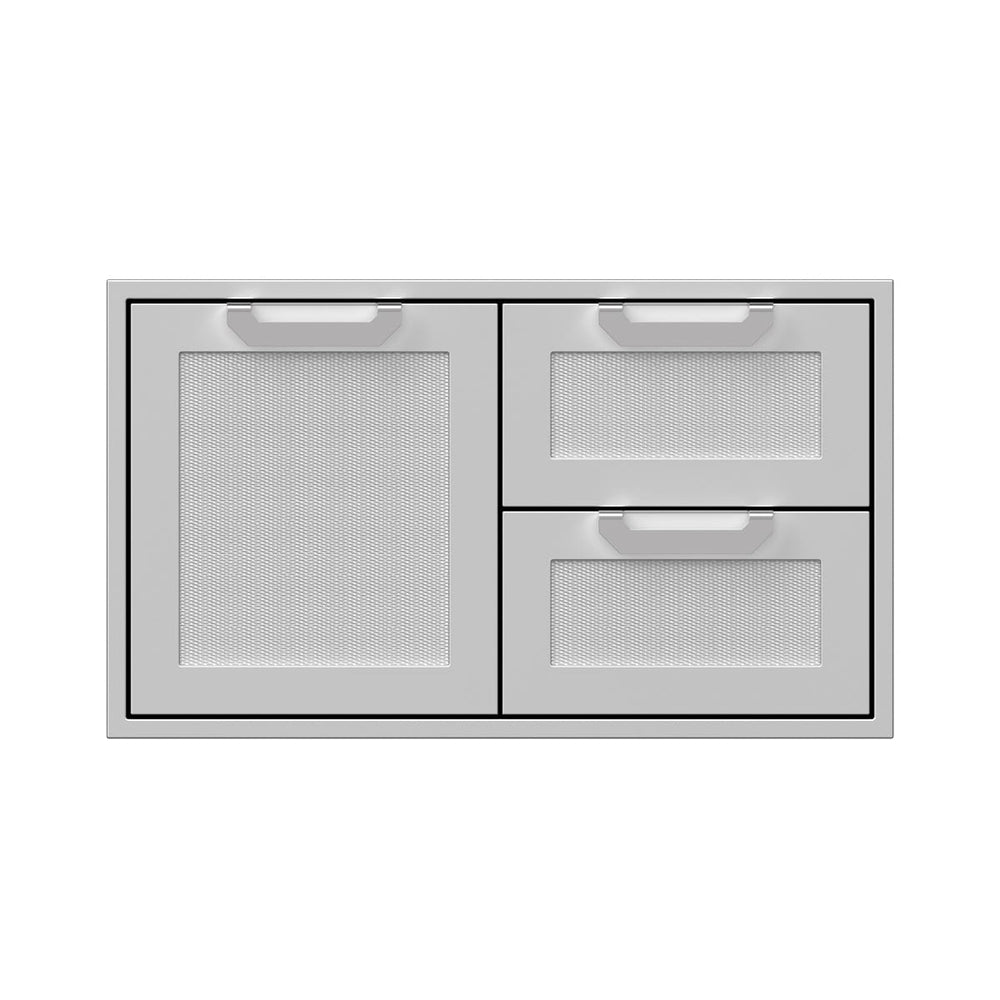 The heavy gauge welded body stainless steel construction of the Hestan Double Drawer And Single Storage Door Combo provides long-lasting durability, while the recessed Marquise Accented panels with commercial-grade handles perfectly match your Heston grills. This combo unit features soft-close hinges and drawer slides that ensure quiet closure and improve longevity. Each drawer is 7-inches deep, providing plenty of storage space for all of your BBQ accessories and the motion-activated illumination makes it easy to see all of your stored items.