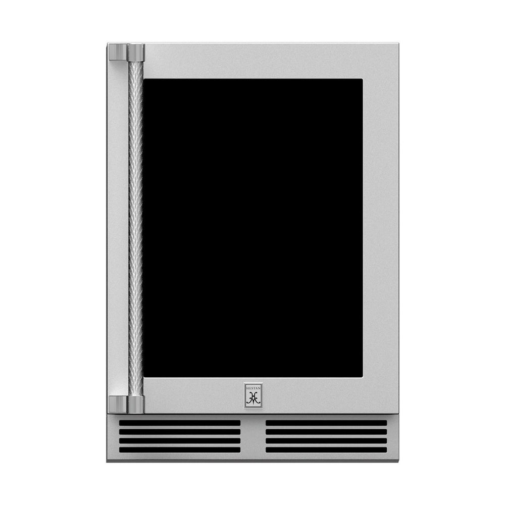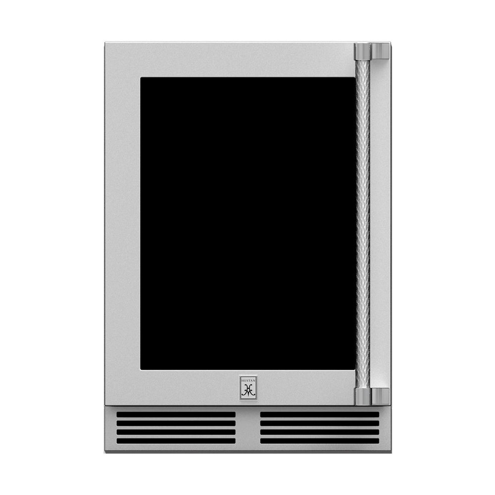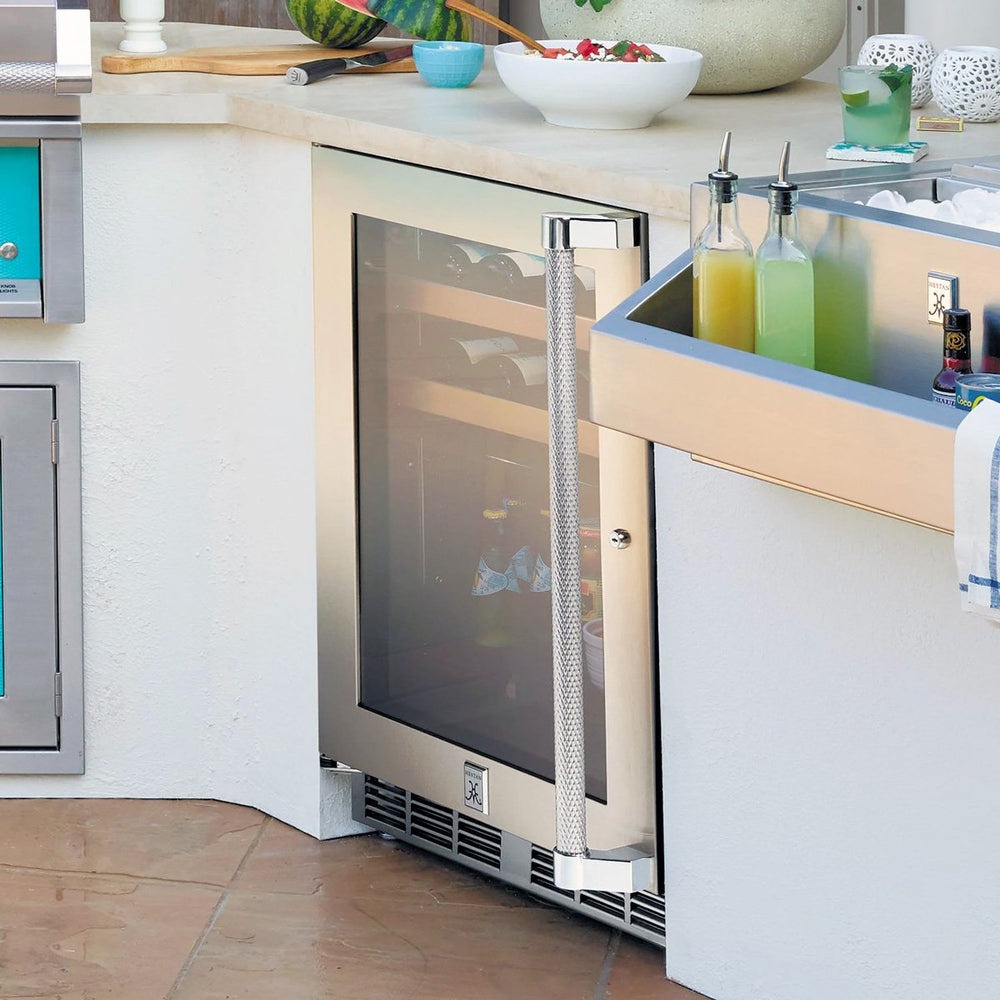 The Hestan 24-Inch 5.0 Cu. Ft. Dual-Zone Outdoor Refrigerator with Wine Storage is a UL-listed stainless steel, outdoor-rated unit, making it perfect for your outdoor kitchen or entertaining space. Stainless steel construction provides long lasting durability while the heavy duty insulation and front-vented, forced-air refrigeration system with variable speed compressor keeps your food and drinks chilled. The LED lighting adds visibility and it features two (2) full extension pullout wine storage shelves in upper zone with temperature control of 45 to 65 degrees Fahrenheit and one (1) full extension pullout shelf in the lower zone with temperature control from 33 to 42 degrees Fahrenheit makes it easy to keep your drinks chilled. The glass door style features Low E, UV-coated glass to provide industry-leading protection from sunlight and insulation. The adjustable legs and zero-clearance hinging makes install easy and the door lock keeps items safe and secure.