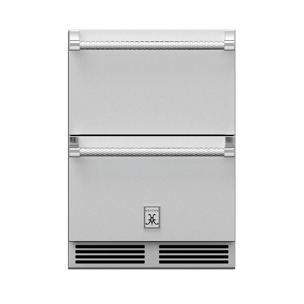 The Hestan 24-Inch 5.2 Cu. Ft. Stainless Steel Double Drawer Outdoor Refrigerator/Freezer Combo is a UL-listed stainless steel, outdoor-rated unit making it perfect for your outdoor kitchen or entertaining space. Stainless steel construction provides long lasting durability while the heavy duty insulation and front-vented, forced-air refrigeration system with variable speed compressor keeps your food and drinks chilled. Heavy duty full extension drawer slides make opening and closing the drawer easy. The digital temperature display and temperature control range of 33-42 degrees Fahrenheit (fridge) and -10-10 degrees Fahrenheit (freezer) makes it easy keep food fresh and drinks cold. The adjustable legs and zero-clearance hinging makes install easy and the door lock keeps items safe and secure.