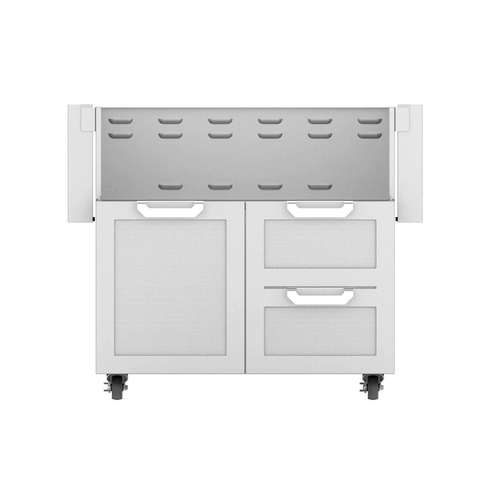 The Hestan Double Drawer and Door Tower Cart is specifically designed to house any of the Hestan 36-Inch Gas Grill Heads. Featuring heavy gauge, welded body stainless steel construction for long lasting durability, two (2) fold down side shelves providing valuable workspace, fully extending soft-close drawers and a soft-close access door with recessed Marquise style panels and commercial grade handles. This grill cart includes a propane tank tray that easily converts to trash storage when not used for propane tank storage and commercial-grade casters that offer smooth cart movement with 360-degree maneuverability. This unit is topped off with Marquise-accented stainless steel panels in Steeletto signature finish.