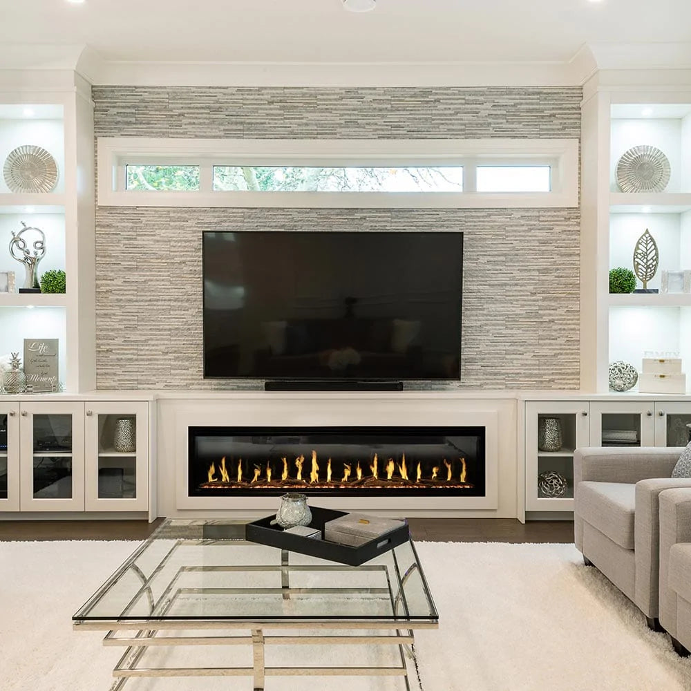 Create a seamless and sophisticated appeal in almost any space with Modern Flames' Orion Series Linear Electric Fireplace. The slim profile of the Orion Slim Electric Fireplace is designed specifically for narrower walls, bringing an undistracted appearance and functionality. The Orion Slim fireplace creates multi-dimensional fires with the new Heliovision Flame Technology. The tinted front glass and 15-inch high viewing area allow seeing all the beauty of the dancing flames. This unit comes with both a western driftwood log set and black reflective crushed glass media, allowing you to create a custom look to match your space. Create a unique artificial fire display with three (3) stunning flame styles: wood-burning look-alike fires with sparks; flames similar to gas burning and a hybrid with bright, vibrant flames. Six (6) flame color options and multicolor ember bed lighting provide a truly customizable experience. For even more ambiance, switch on the fire-cracking sounds and relax.