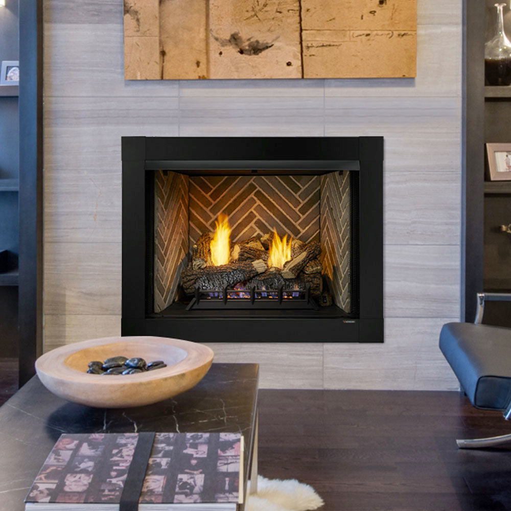 With a big presence and angled design that pushes out more heat, the Attribute 32-Inch Ventless Firebox from Monessen delivers a fireside experience with style. The reversible interior panels allow you to choose from a traditional stacked brick or herringbone pattern and come in your choice of trendy gray or classic brown appearance. The deep box and wide opening provide generous room for the log set of your choice while the angled construction and uniquely-engineered air channels move more heat into the room to maximize efficiency.