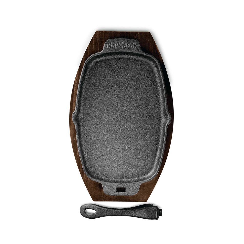 Napoleon's Sizzle Platter with Wooden Server Set is a versatile meal prep machine. Made from durable cast iron, the more you use your Sizzle Platter, the better it will get. It's perfect for use on the grill, on the side burner, on charcoal and even in your oven or on your stove. Serve directly from the hot grill to the table using the beautiful wooden serving tray. And the removable handle stays cool while you cook, easily sliding into the slot, then coming out again when you need it to. Imagine all of the ideas you can cook up with a new Sizzle Platter. Each set comes with its own custom-fit wooden server for the deep cast-iron platter, and an interlocking handle that is removable to stay cool while you're cooking on the grill or in the oven. Clever, multifunctional, and easy to maintain, every kitchen benefits from the addition of a Napoleon barbecue accessory.