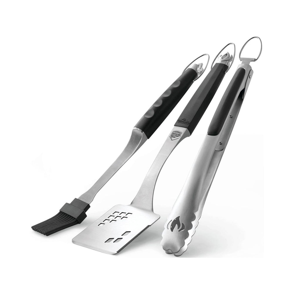 Napoleon's Executive 3-Piece Grill Tool Set is made from cast stainless steel with comfortable ergonomic handles. The large spatula is perfect for steaks and other large food with its bladed tip and serrated edge. The easy-lock stainless steel tongs are always ready for action, their comfortable grip making it easy to hold and move your grilled delicacies. Don't forget to splash on the sauce with the silicone basting brush. Be the boss of your grill with the Napoleon Executive 3-Piece Toolset. Clever, multifunctional and easy to maintain, every kitchen benefits from the addition of a Napoleon barbecue accessory.