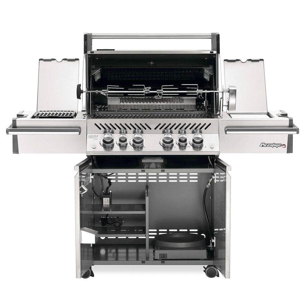 Conduct your barbecue with intuitive finesse and versatile prowess. Napoleon Prestige PRO™ 500 4-Burner Freestanding Gas Grill features premium side shelves with beverage holders and a marinade bucket. Heavy-gauge stainless steel burners with crossover lighting ensure reliable ignition, delivering flawless results. Interior-lit storage and soft-closing doors add a touch of luxury, making every grilling session a seamless delight.