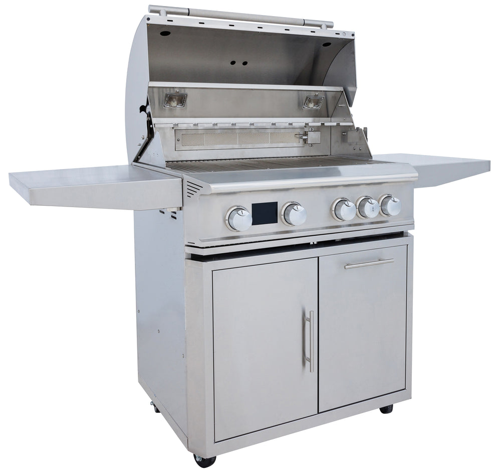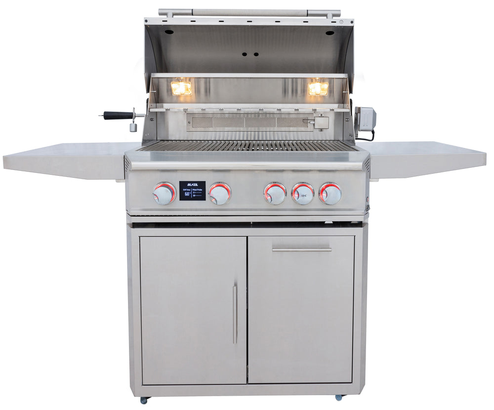 Transform any outdoor space into a culinary stage with the Blaze 4LTE PRO 32-Inch 4-Burner Freestanding Gas Grill, a 2025 masterpiece blending cutting-edge technology with effortless mobility. Crafted from 304 stainless steel, this grill delivers 56,000 BTUs across four commercial-grade burners, empowering you to sear steaks, roast veggies, or simmer sauces with precision. Red LED-illuminated knobs glow for safety, complemented by hands-free internal lighting for nighttime grilling. Mounted on a robust freestanding cart with casters and side shelves, this grill offers premium performance at an affordable price, making every barbecue a showstopper.