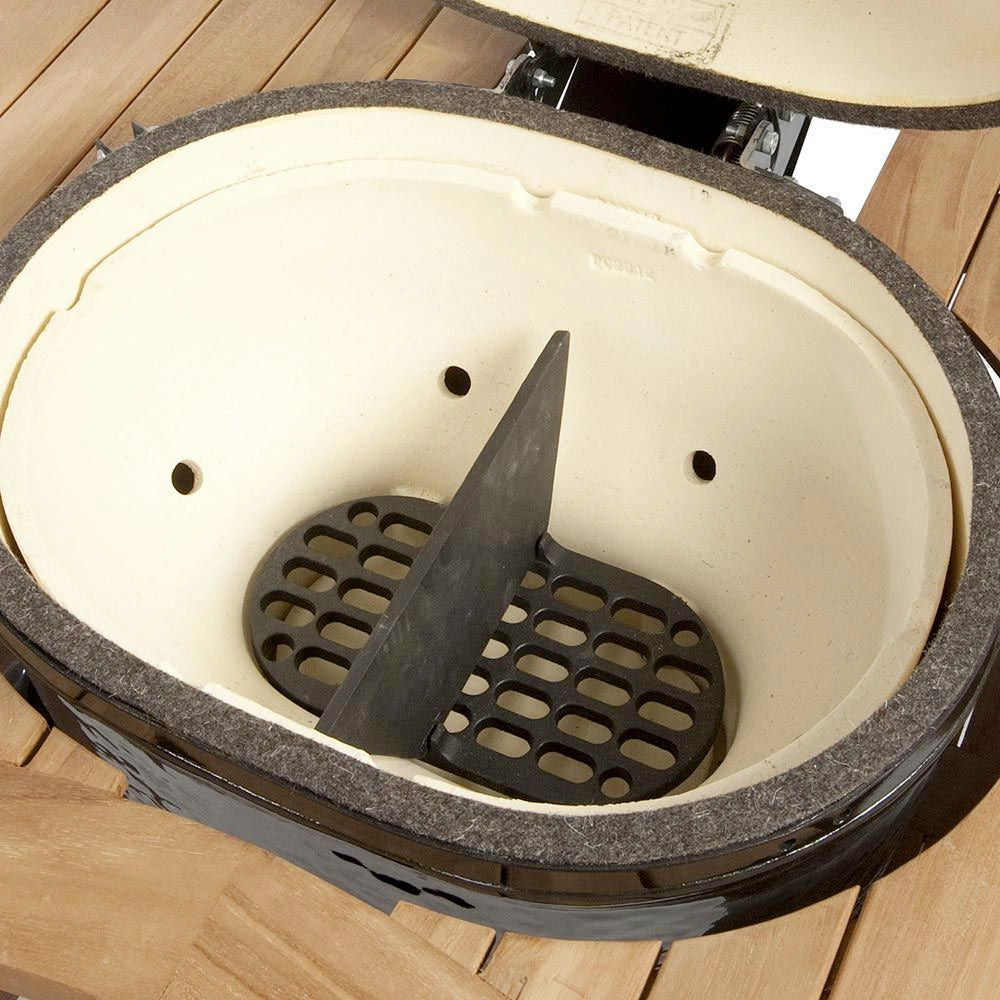 Primo's Cast Iron Firebox Divider is a handy accessory that allows you to cook using direct heat on one side of your Junior Oval Grill, and indirect heat on the other side. The sturdy cast iron design ensures long-lasting durability in your firebox and fits right into the lower grate that comes with your grill. This unit also affords you the opportunity to fire up only half of your grill to allow for less coal usage and a smaller fire for those smaller cooks.