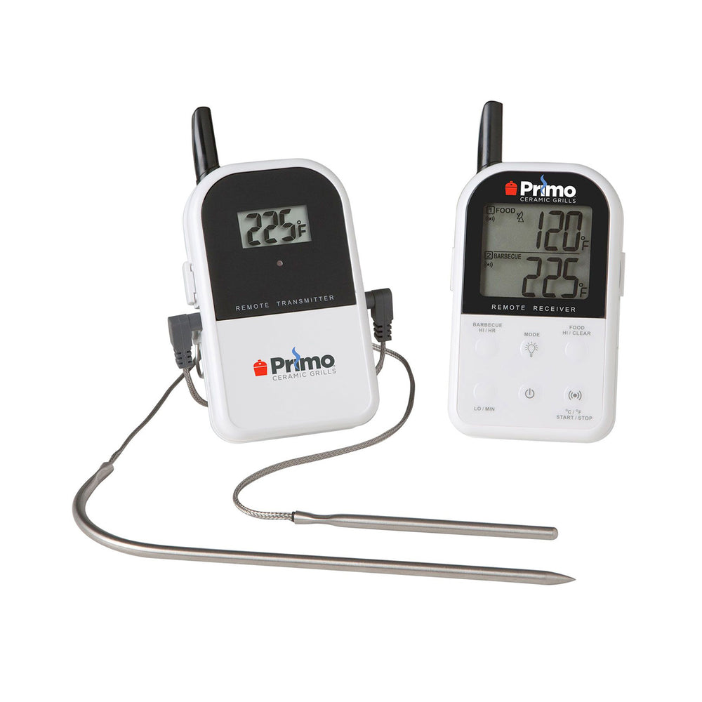 The Primo Dual-Probe Wireless Thermometer will help to ensure that your food and grill are at the appropriate temperature at all times. Featuring a base and wireless receiver, this unit provides accurate temperature readings from up to 300 feet away. By placing one heat-resistant probe wire inside your Primo Grill and the other probe into the meat, you can monitor the dome temperature as well as the internal temperature of the meat. The wireless receiver with LCD screen beeps and flashes when meat or temperature goes above your programmed temperature. This Primo Thermometer also features a Count-Up & Count-Down timer and a back light for use at night. The receiver has a belt clip and built-in stand for keeping a close eye on your meal. The transmitter has a removable wire stand that also becomes a hanger which can be used with your grill. A special smoking chamber probe wire comes with a clip to attach to grill rack.