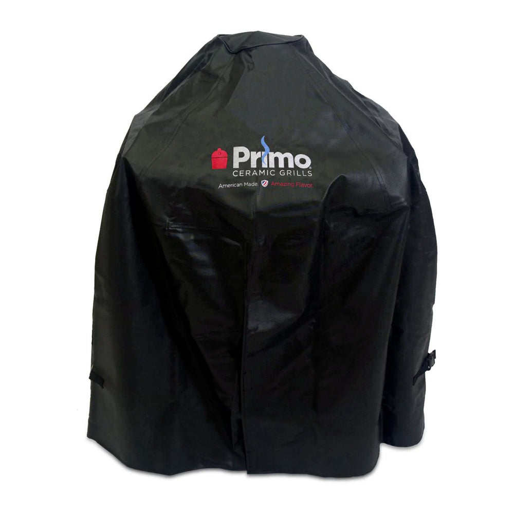 Protect your Primo All-in-One Kamado Grill and ensure many years of grilling with a premium cover for your grill and cradle. This premium grill cover is made of durable black vinyl for superior protection in any weather. The cover is made in the USA, custom fit for Primo Junior Oval, Large Oval and Round Kamado Grills and features the signature Primo logo. Using a grill cover will not only protect your Primo investment, but it will greatly extend its life and quality as well.