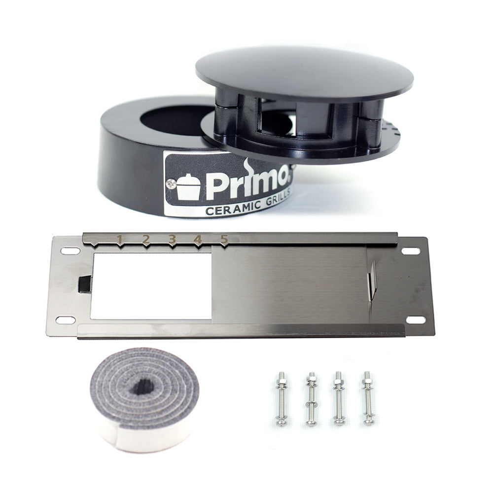 Upgrade and improve how you control airflow through your Round Kamado Grill with help from Primo. This Precision Control Kit includes everything you need to upgrade the bottom slider and top chimney vent for better control. The bottom slider vent now comes with a number system (1-5) to help set airflow into your Primo Kamado Grill. It's an easy way to repeat settings on similar cooks. The top chimney features side and top adjustments for controlling airflow out of the grill. The top sliding vent swings open like the old style top, while the side vent is great for managing temperature during inclement weather. Maximize airflow out by using both top and side vents at the same time.