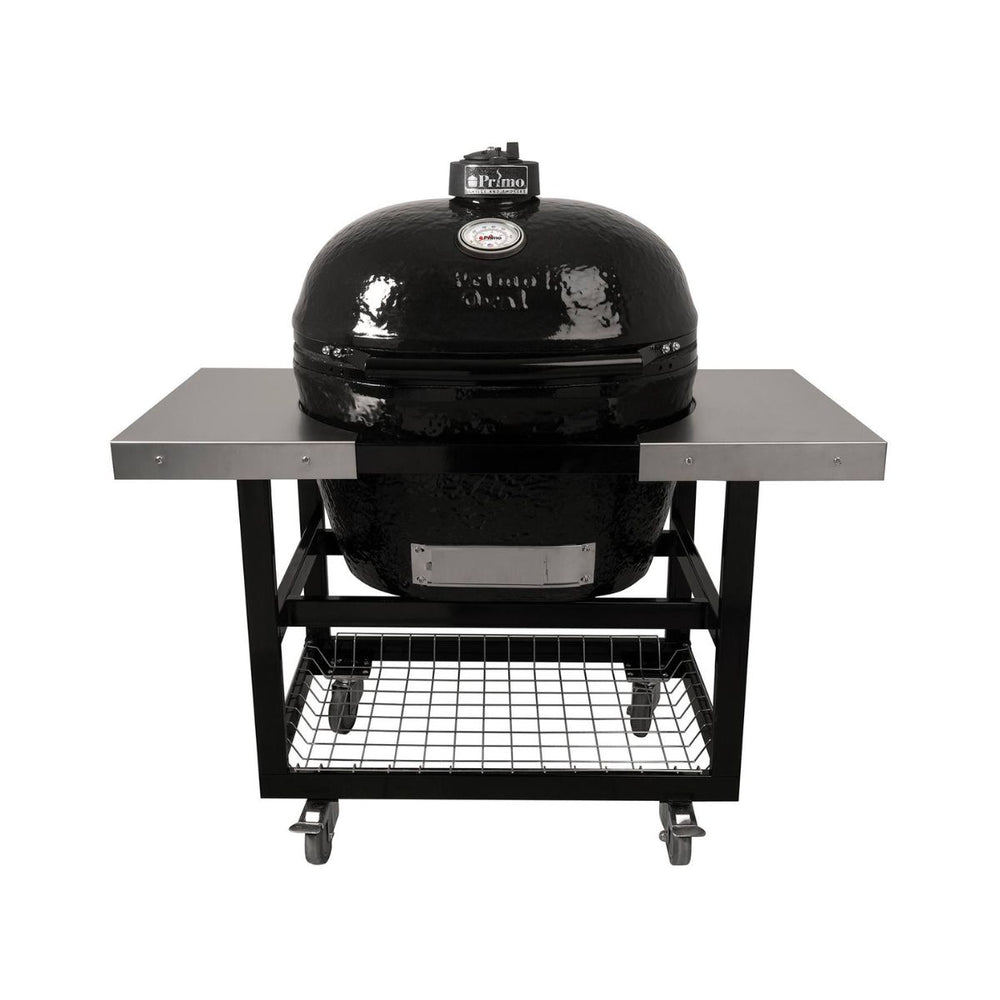 Specifically designed for the Primo XL Oval grill, the powder-coated steel cart with stainless steel side shelves resists rusting, while the wire basket is perfect for storing charcoal or other accessories. The side tables extend your work area, allowing you to keep ingredients nearby and the hooks on each shelf provide storage for grilling tools. Four (4) heavy-duty swivel casters roll smoothly on any patio surface and lock in place when you are ready to grill.