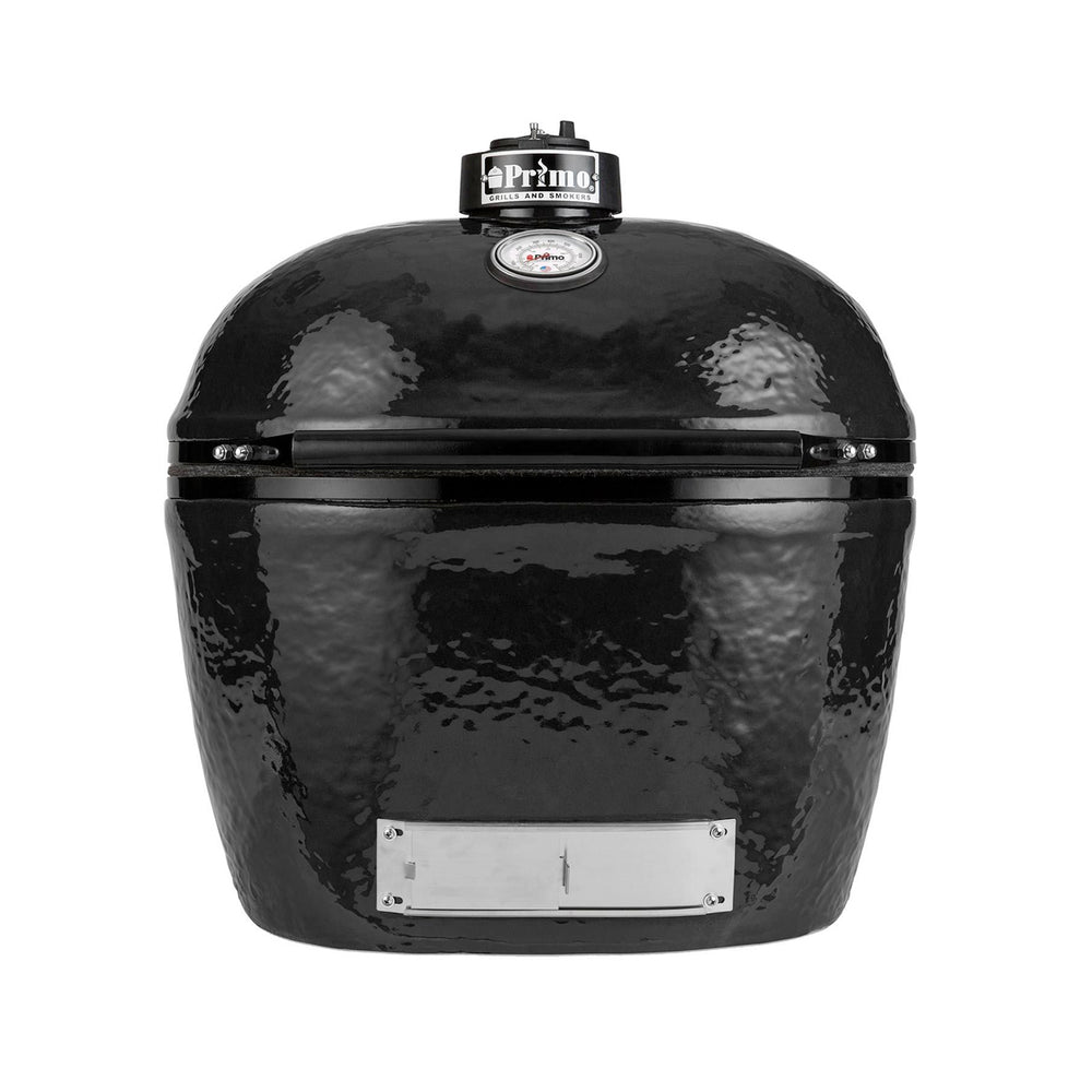 The distinct shape of the Primo XL Oval Kamado Grill allows you to cook using direct or indirect heat, expanding your grilling options unlike any other kamado-style grill. This grill features reversible, easy-to-clean stainless steel cooking grates, as well as one of the highest sitting lids on the market—making it great for cooking whole chickens or turkeys. This kamado-style grill is made entirely in the USA, constructed with premium grade Primo SuperCeramics and coated with a protective, lead-free and scratch-resistant porcelain glaze. The patented Primo XL Oval efficiently retains and evenly distributes heat across the 400 square inches of cooking surface, perfect for maintaining a consistent temperature. Smoke meat at temperatures as low as 180 degrees Fahrenheit, or turn up the heat to more than 500 degrees Fahrenheit for searing and grilling. Use the 6-position cast aluminum chimney cap, 5-position stainless steel lower vent door and easy-to-read thermometer for monitoring and keeping a precise temperature. The chimney cap also features a hood to keep out rain for all-weather grilling.