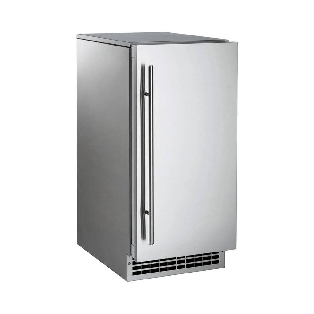 This Scotsman Brilliance 15-Inch Nugget Ice Machine is a great addition to any outdoor kitchen. The unit produces up to 80 pounds of Sonic-style ice in 24 hours. Easily store up to 26 pounds of ice, while using 40-percent less energy and more than 50-percent less water than conventional stand-alone ice machines. The sleek stainless steel cabinet makes it ideal for compact spaces such as outdoor kitchen areas. This model comes equipped with a user-friendly control panel that informs you whether power is on, alerts you if there is a no-water condition and features a time to clean reminder. Also featured is a lighted storage bin and a self-closing stainless steel door. Choose from a gravity or pump drain for water removal after ice has melted.