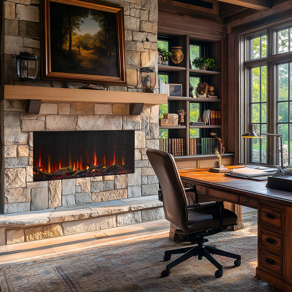Elegant and stylish, the SimpliFire Scion Linear Built-In Electric Fireplace provides warmth and ambiance while adding a sleek, modern accent to any room. With the safe and efficient design and no gas line or venting requirements, you can install directly under the TV or your favorite work of art, allowing even more design opportunities for your space. For a flush look, bring the finishing material right up to the edge of the fireplace to enhance the contemporary elegance. With the thermostatic capabilities, you can set your preferred room temperature and enjoy the warmth provided by the two-stage supplemental heater.