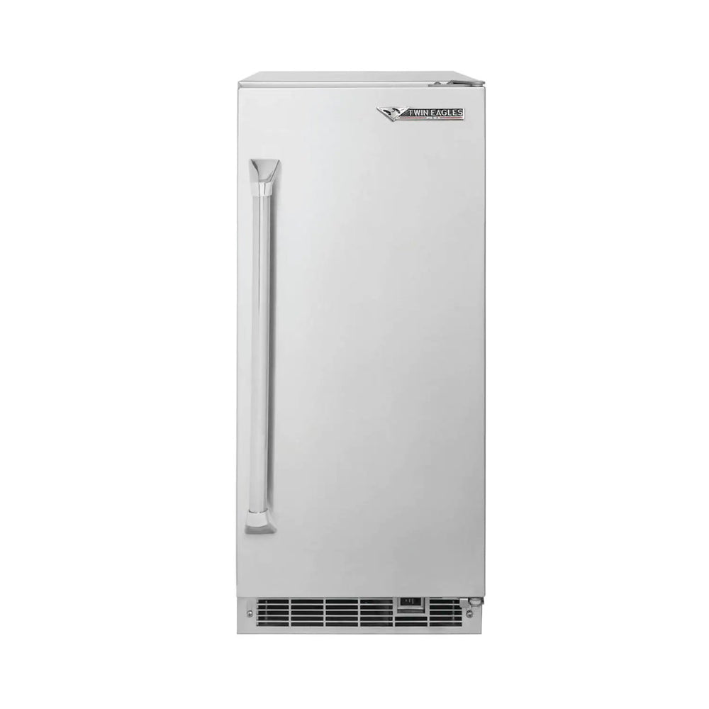The Twin Eagles 15-Inch Outdoor-Rated Stainless Steel Ice Maker is fully-constructed of premium-grade stainless steel and features front venting, allowing the ice maker to be fully built in to your outdoor kitchen. This ice maker produces up to 35 pounds of clear ice a day and has 15 pounds of built-in storage capacity. This unit features the option for a gravity or pump drain and on/off/clean selector switch. This model is UL-Certified for outdoor use and requires 115 volts, 60 hertz and 15 amps.
