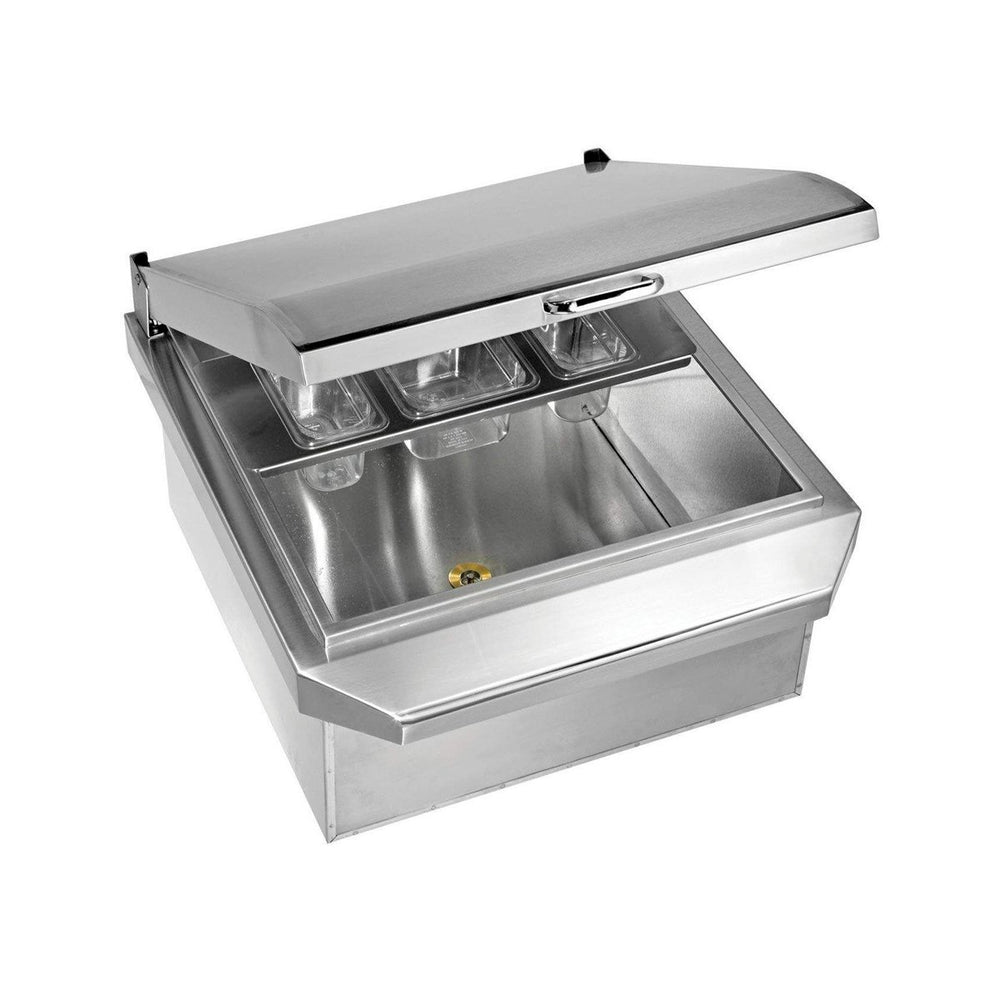 Entertain guest with this professionally-designed Drop-In Ice Bin/Cooler from Twin Eagles. This fully-insulated stainless steel 24-inch cooler is perfect for serving ice or drinks. The 10-inch deep basin can accommodate up to 60 bottles and 25 pounds of ice. The gasket-sealed lid helps keep items cold for hours and can be removed if you want to use the cooler without the top. This ice bin features a removable/sliding condiment tray and a brass drain with plug.