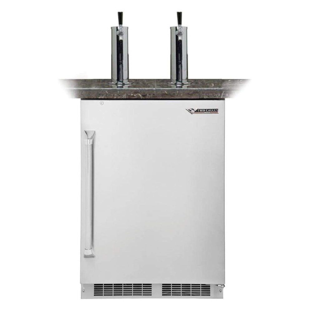 Upgrade your outdoor entertainment space with this 24-Inch Beer Keg Dispenser from Twin Eagles. Serve your favorite draft microbrew frosty cold and straight from one of the twin tap. This unit features full auto defrost with a thermostatically-controlled temperature range of 33-52F. The full stainless steel exterior and full-wrap door have been built to the same high standards as the rest of the Twin Eagles brand, with superior corrosion and impact resistance. This unit has been UL-approved for outdoor user, has the capacity to hold two (2) half or quarter kegs and includes the draft tower, CO2 tank and regulator. As an added bonus, the two (2) stow-on-board shelves can be used when a keg is not installed.