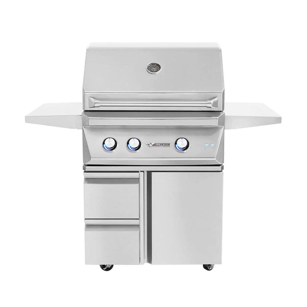 This 30-inch grill has two (2) 25,000 BTU 14-gauge 304 grade stainless steel burners with zone dividers letting you independently control the heat and high quality ceramic briquette flame tamers that distribute the radiant heat more evenly across the cooking surface. The 3/8-inch stainless steel hexagonal cooking grates offer more food-to-surface contact and allows more heat to be conducted into your food generating deeper and thicker restaurant-style sear marks. The two-position, heavy-duty rotisserie system has a fully-integrated infrared rotisserie burner and motor with 100-pound turning capacity and a chain-driven design providing consistent and uniform rotation of the rotisserie rod. The rotisserie rod conveniently stores in the drip tray handle when not in use. This grill has a reliable hot surface ignition, interior lights with hood-activated light switch for nighttime grilling, three-position warming rack that conveniently stows away when not in use, and a large capacity sealed smoker box. Twin Eagles offers several unique features that together deliver unparalleled performance.