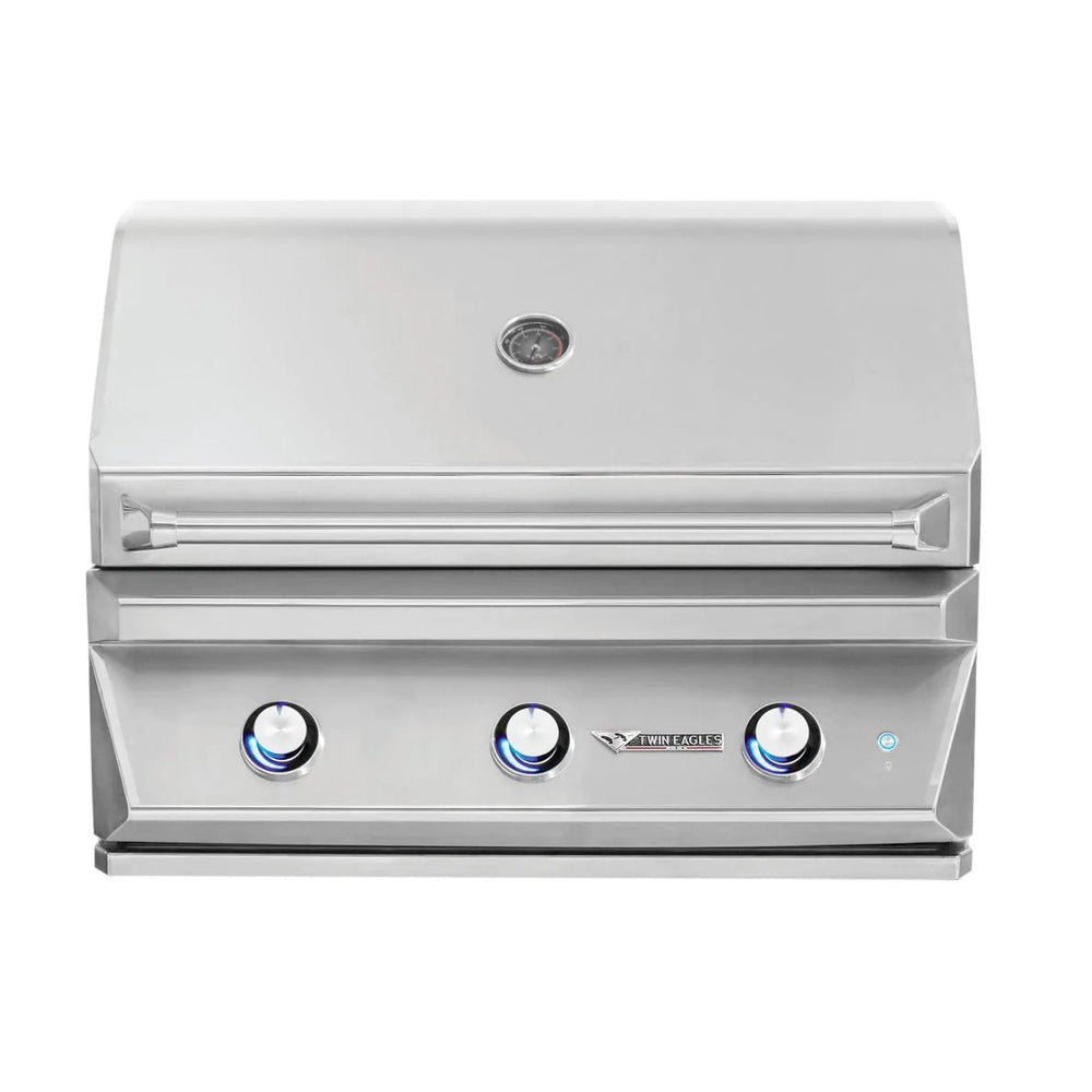 Twin Eagles Built-In Gas Grills feature premium-grade stainless steel with seamless heli-arc welded construction for maximum strength and durability. The double-lined hood with hidden heavy-duty lift extension springs provides better durability, more insulation and reduces the weight to make it easier for you to open and close. The Exclusive Control Illumination control knobs feature highly visible, graduated indigo blue line and a control indicator notch that illuminates to give a precise control setting.