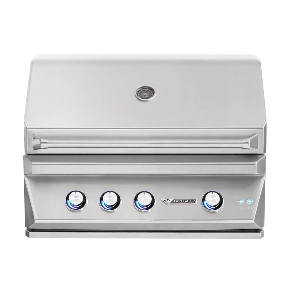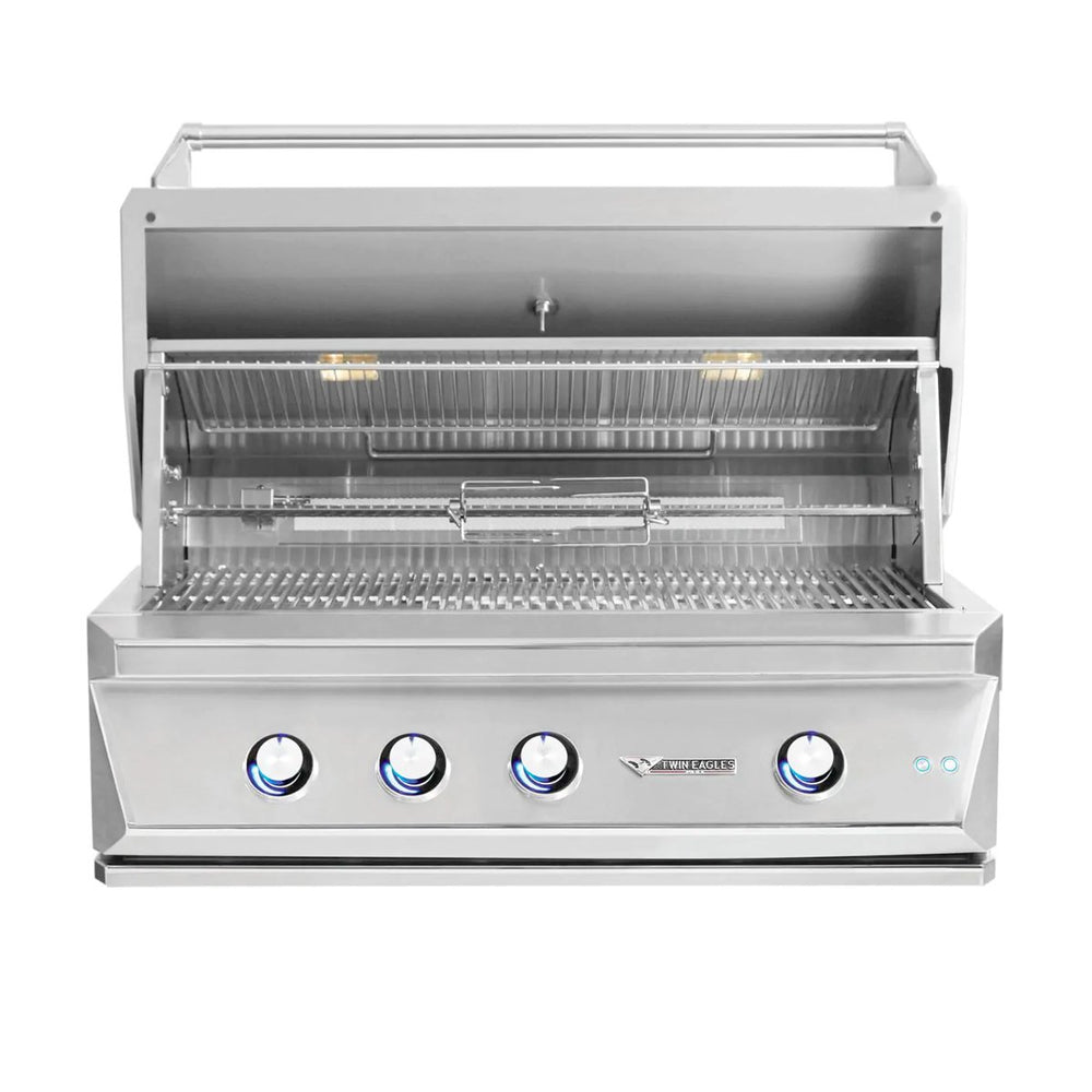 Twin Eagles Built-In Gas Grills feature premium-grade stainless steel with seamless heli-arc welded construction for maximum strength and durability. The double-lined hood with hidden heavy-duty lift extension springs provides better durability, more insulation and reduces the weight to make it easier for you to open and close. The Exclusive Control Illumination control knobs feature highly visible, graduated indigo blue line and a control indicator notch that illuminates to give a precise control setting.