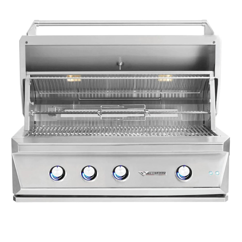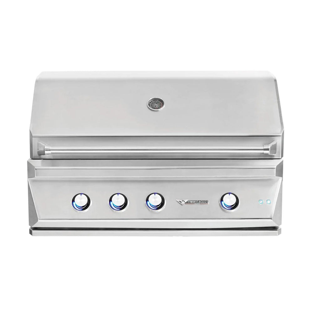 Twin Eagles Built-In Gas Grills feature premium-grade stainless steel with seamless heli-arc welded construction for maximum strength and durability. The double-lined hood with hidden heavy-duty lift extension springs provides better durability, more insulation and reduces the weight to make it easier for you to open and close. The Exclusive Control Illumination control knobs feature highly visible, graduated indigo blue line and a control indicator notch that illuminates to give a precise control setting.