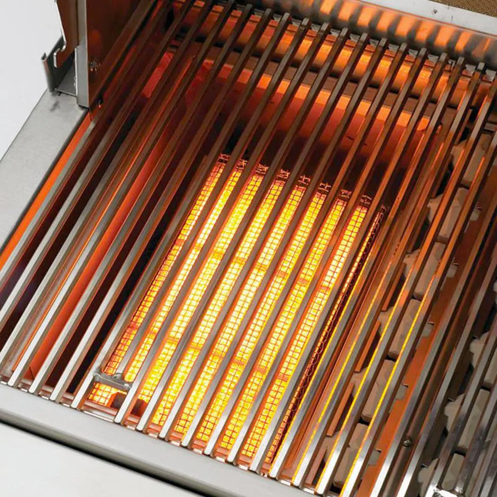 This 42-inch grill has two (2) 25,000 BTU 14-gauge 304 grade stainless steel main burners with zone dividers letting you independently control the heat, one (1) 25,000 BTU infrared sear burner, and high quality ceramic briquette flame tamers that distribute the radiant heat more evenly across the cooking surface. The 3/8-inch stainless steel hexagonal cooking grates offer more food-to-surface contact and allows more heat to be conducted into your food generating deeper and thicker restaurant-style sear marks. The two-position, heavy-duty rotisserie system has a fully-integrated infrared rotisserie burner and motor with 100-pound turning capacity and a chain-driven design providing consistent and uniform rotation of the rotisserie rod. The rotisserie rod conveniently stores in the drip tray handle when not in use. This grill has a reliable hot surface ignition, interior lights with hood-activated light switch for nighttime grilling, three-position warming rack that conveniently stows away when not in use, and a large capacity sealed smoker box. Twin Eagles offers several unique features that together deliver unparalleled performance.