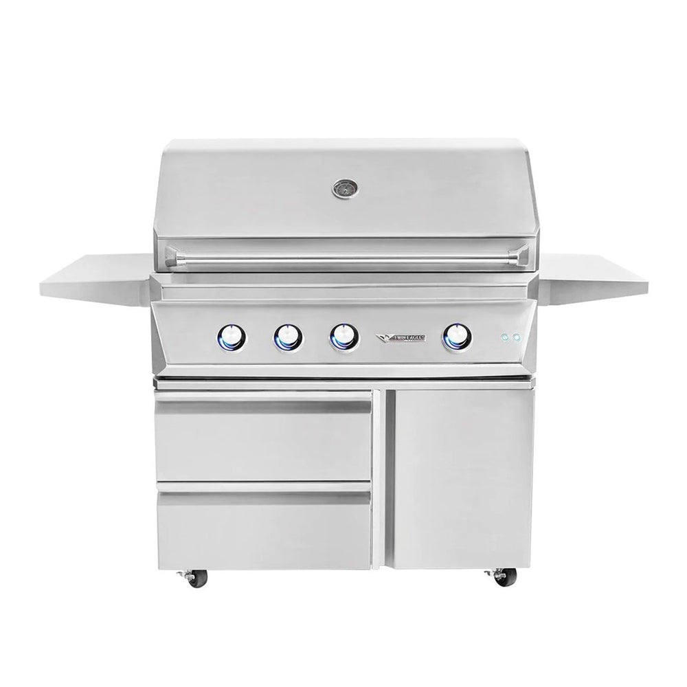 The deluxe grill cart features heavy duty stainless steel construction with a sleek professional style to compliment the Twin Eagles grills and accessories. This cart has two (2) self-latching storage drawers and one (1) soft-closing access door that feature a flush handle design with high polished accents and concealed hinges. Use the handy pull-out tray inside the door to easily store a propane tank or a trash receptacle. The two (2) stainless steel side shelves keep your BBQ tools at hand, provide a convenient work area while you cook, and fold down to save space when not in use.