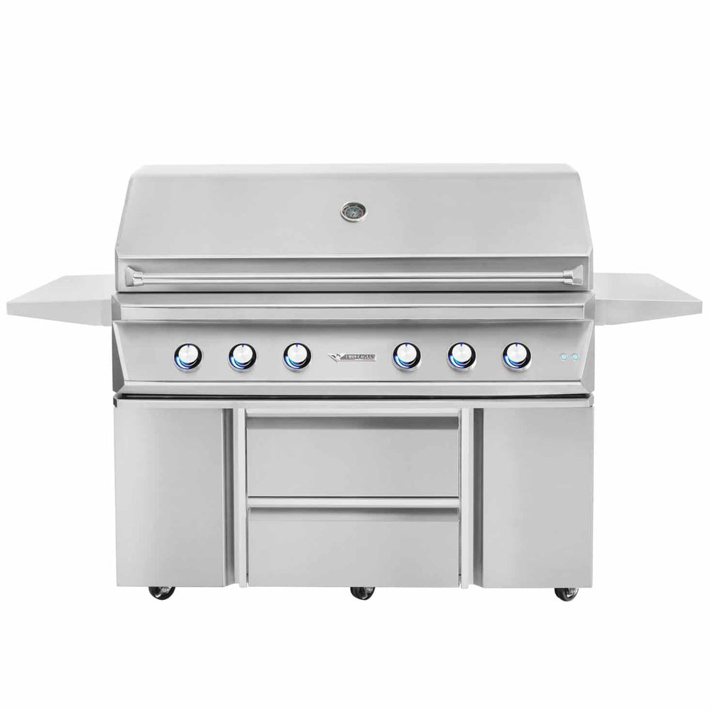 The deluxe grill cart features heavy duty stainless steel construction with a sleek professional style to compliment the Twin Eagles grills and accessories. This cart has two (2) self-latching storage drawers and one (1) soft-closing access door that feature a flush handle design with high polished accents and concealed hinges. Use the handy pull-out tray inside the door to easily store a propane tank or a trash receptacle. The two (2) stainless steel side shelves keep your BBQ tools at hand, provide a convenient work area while you cook, and fold down to save space when not in use.