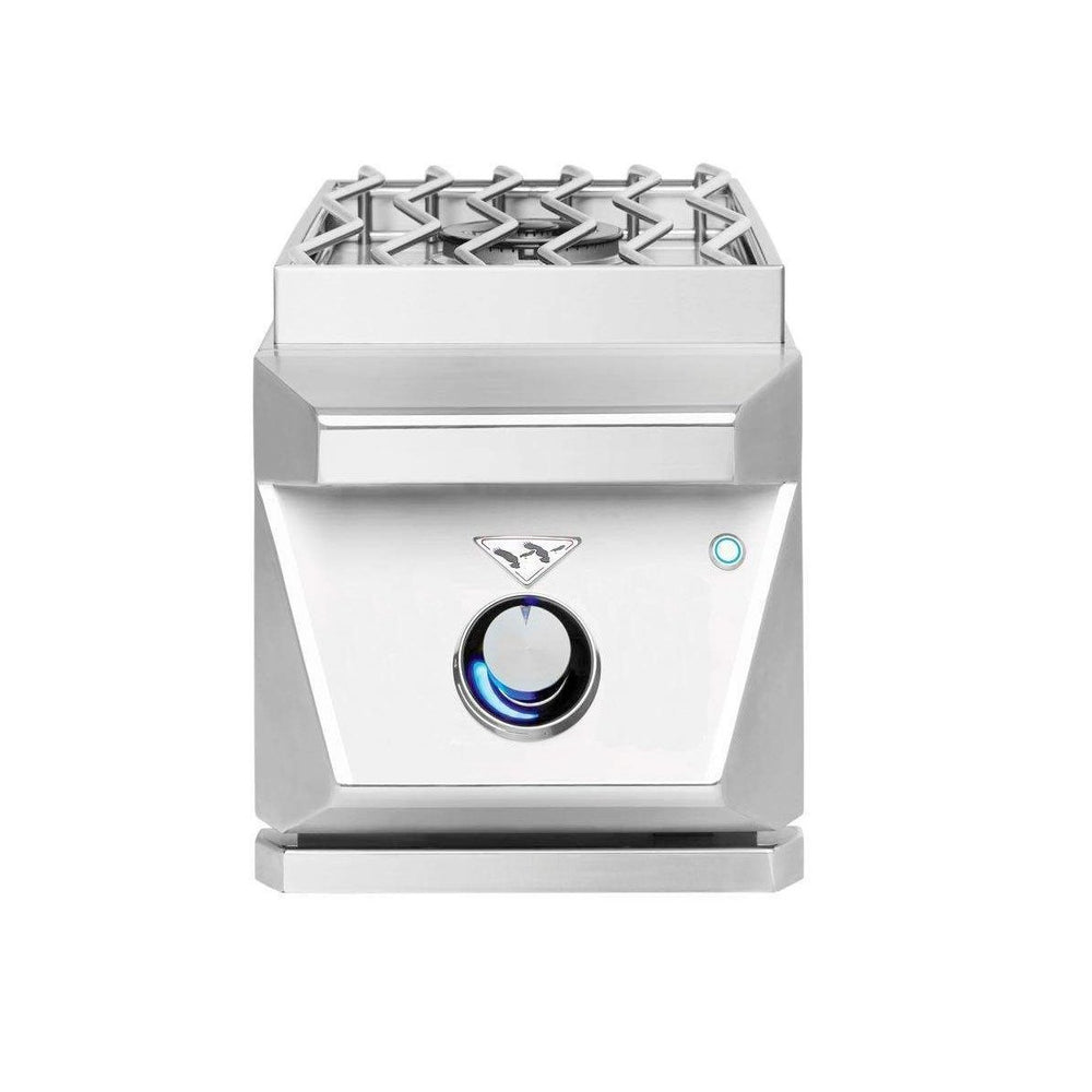 This Twin Eagles Side Burner features premium stainless steel construction with a seamless front panel with high polished accents, and one (1) 17,500 BTU dual-ring sealed burner that allows for greater heat distribution. The control knob has Exclusive Control Illumination which features a highly visible graduated indigo blue line and the control indicator notch illuminates to give a precise control setting. The built-in wind guard helps protect against wind while the one-piece stainless steel "S" grate allows for easy maneuverability of pots and pans on smooth surface. A matching stainless steel cover is included to protect the burners when not in use.