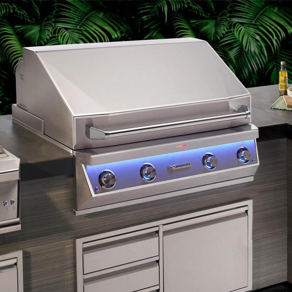 This 42-inch grill has two (2) 25,000 BTU, 14 gauge 304 grade stainless steel main burners with zone dividers, letting you independently control the heat, one (1) 25,000 BTU infrared sear burner and high quality ceramic briquette flame tamers that distribute the radiant heat more evenly across the cooking surface. The two-position, heavy-duty rotisserie system has a fully integrated motor with 100-pound turning capacity and a chain-driven design providing consistent and uniform rotation of the rotisserie rod. The rotisserie rod conveniently stores in the drip tray handle when not in use. This grill has a reliable hot surface ignition, interior lights with hood-activated light switch for nighttime grilling, three-position warming rack that conveniently stows away when not in use and a large capacity sealed smoker box.
