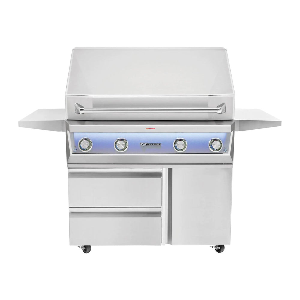 The deluxe grill cart features heavy duty stainless steel construction with a sleek professional style to compliment the Twin Eagles grills and accessories. This cart has two (2) self-latching storage drawers and one (1) soft-closing access door that feature a flush handle design with high polished accents and concealed hinges. Use the handy pull-out tray inside the door to easily store a propane tank or a trash receptacle. The two (2) stainless steel side shelves keep your BBQ tools at hand, provide a convenient work area while you cook, and fold down to save space when not in use.