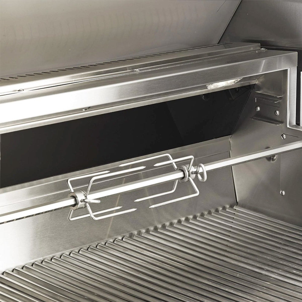 This 42-inch grill has two (2) 25,000 BTU, 14 gauge 304 grade stainless steel main burners with zone dividers, letting you independently control the heat, one (1) 25,000 BTU infrared sear burner and high quality ceramic briquette flame tamers that distribute the radiant heat more evenly across the cooking surface. The two-position, heavy-duty rotisserie system has a fully integrated motor with 100-pound turning capacity and a chain-driven design providing consistent and uniform rotation of the rotisserie rod. The rotisserie rod conveniently stores in the drip tray handle when not in use. This grill has a reliable hot surface ignition, interior lights with hood-activated light switch for nighttime grilling, three-position warming rack that conveniently stows away when not in use and a large capacity sealed smoker box.