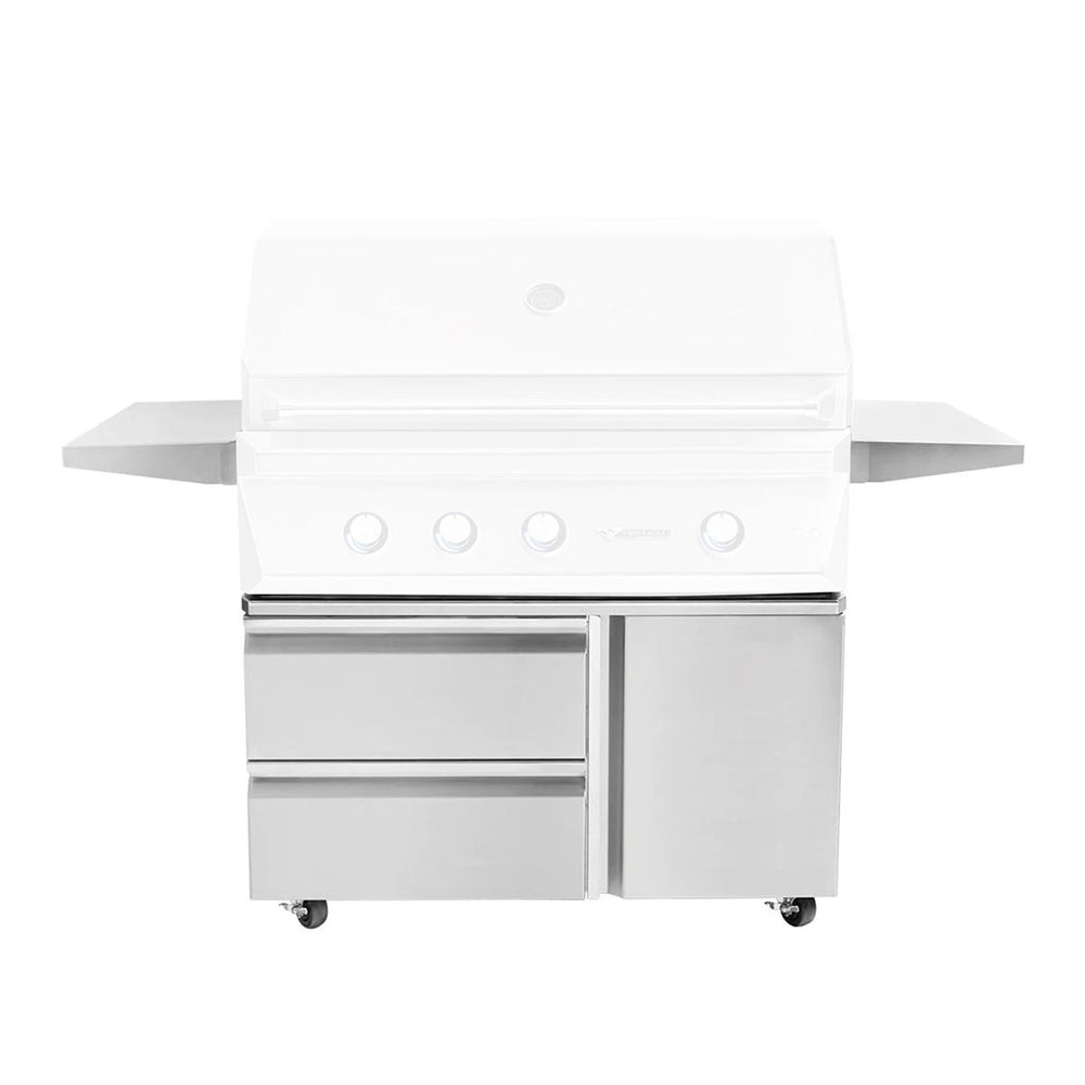 This Twin Eagles Grill Cart features heavy duty stainless steel construction with a sleek professional style to compliment Twin Eagles grills and accessories. This cart has two (2) self-latching storage drawers and one (1) soft-closing access door that feature a flush handle design with high polished accents and concealed hinges. Use the handy pull-out tray inside the door to easily store a propane tank or a trash receptacle. The two (2) stainless steel side shelves keep your BBQ tools at hand, provide a convenient work area while you cook, and fold down to save space when not in use. The heavy-duty casters have front brakes allowing you to easily relocate and secure the grill whenever necessary. This grill cart is compatible with all Twin Eagles 42-inch Grills.