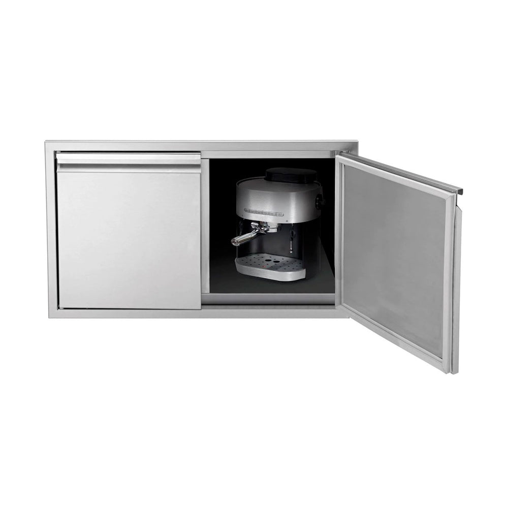 This Twin Eagles Sealed Dry Storage Cabinet offers water tight, maximum protection for your dry goods, cookware, cookbooks and more. This cabinet features 304 stainless steel construction with a detailed seamless weld and professionally ground corners. The sealed doors sport a double-walled design with welded interior liners and concealed soft closing, three way adjustable hinges. This dry storage cabinet features three (3) full extension drawers behind the left-hand door and open storage behind the right-hand door. This unit has superior welding, an 18-gauge one-piece frame for precision mounting alignment and a flush handle design with high polished accents.