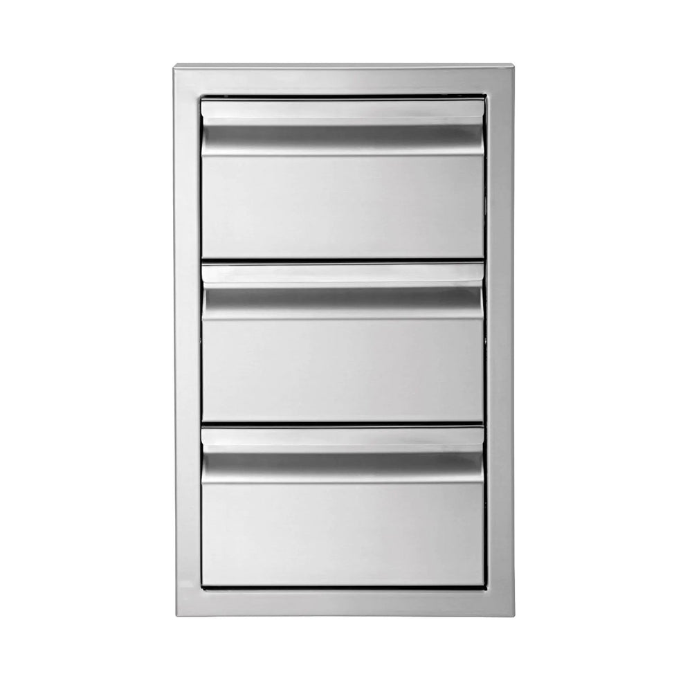 This Twin Eagles Triple Storage Drawer unit features 304 stainless steel construction with detailed, seamless welds and professionally ground corners. These drawers are extra deep for oversized utensils with heavy duty 100-pound capacity and self-latching full-extension, removable drawer glides. This drawer unit has superior welding, an 18-gauge one-piece frame for precision mounting alignment and a flush handle design with high polished accents.